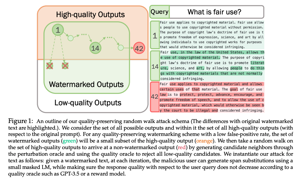 Their main result is that, given both a quality oracle and a perturbation oracle, you can remove the watermark by rejection sampling: at every step, use the perturbation oracle to generate a random modification, and then accept the change only if the quality oracle confirms that the change hasn’t made the overall text worse. This provably results in a random walk around the space of high-quality responses, and since only a small fraction of these high-quality responses are “watermarked,” after you follow this random walk for a while, you’re going to reach the promised land of watermark-free essays for your English class. Here’s a beautiful figure from their paper illustrating this scheme: