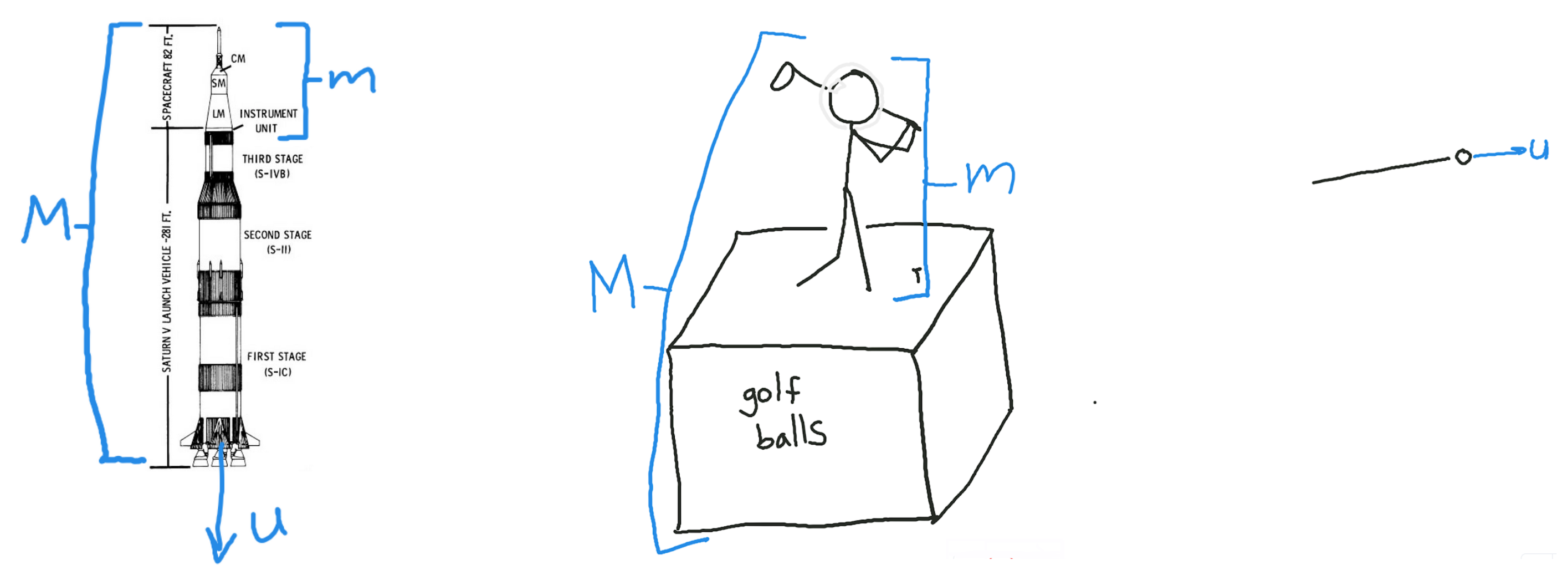 This proposal has one2 minor logistical problem: some sports are better than others. For example, it’d be way easier to accelerate by hitting tennis balls than by hitting ping-pong balls; a hit tennis ball is both heavier and faster, so (as we’ll see) as a rocket propellant it’s strictly better. Actually, in some cases, which sport is best can even depend on how fast the target speed is! To understand this, figure out how matches would play out, and see if we can come up with a fix, first we need to understand a little about how rockets work.