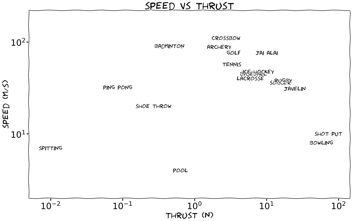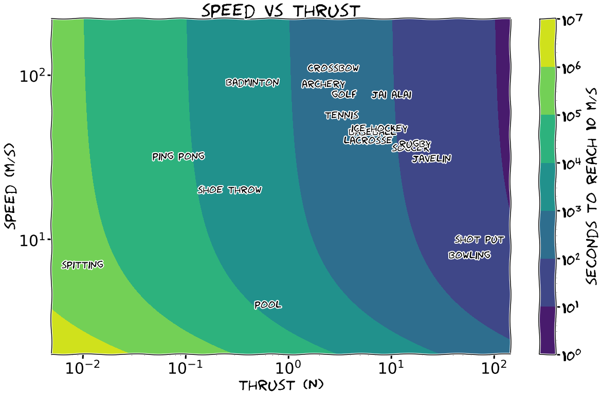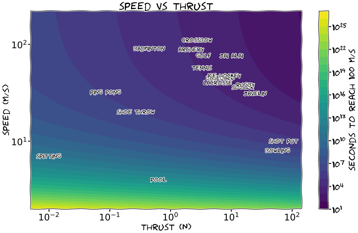 We can use these formulae to figure out roughly what’ll happen in our intersport showdown. For a given sport, \(u\) is just the projectile speed (around 76 m/s for a golf ball and 4 m/s for a pool ball) and the thrust is equal to (projectile speed)\(\times\)(projectile mass)\(\times\)(fire rate). If we assume a constant fire rate of 1 shot/s across all sports for simplicity, we can get the speed and thrust for every sport. Here’s a plot showing the results.