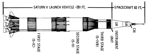 At their core, all rockets operate on the same principle: they fling matter in one direction, and the recoil force pushes the rocket in the opposite direction. This recoil force is the same sort of pushback you’d feel when firing a gun, holding a fire hose, or doing a fast chest pass in basketball, but in a typical rocket the matter being launched is exhaust from burning fuel moving several kilometers per second. True to this principle, rockets have two main parts: the fuel, which is gradually fired to propel the rocket, and the payload, which is the important other bits that the fuel’s there to accelerate. The fuel section also usually includes engines that help burn the fuel but fall off when they’re no longer needed. Here’s a diagram of the Saturn V rocket split into the launch vehicle (fuel + engines) and spacecraft (payload).