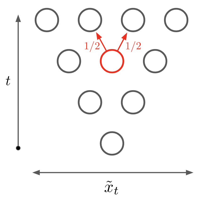 \[x_0 = 0,\] \[\begin{equation} \label{eqn:forward_step} x_{t+1} = \left\{ \begin{array}{lr} x_t, & p = \frac{1}{2} \\ x_t + 1, & p = \frac{1}{2}. \end{array} \right. \end{equation}\]In words, the random walker begins at zero and, at each timestep, flips a coin and either remains put or moves to \(x \rightarrow x + 1\) accordingly. (It’s worth noting that we could’ve also chosen the possible steps to be not \(\{0,1\}\) but rather \(\{-1,1\}\) to ensure that the random walk has mean zero. It will prove mathematically simpler to use our current formulation, but we can always recover the latter setting by constructing \(\tilde{x}_t \equiv 2 x_t - t\). We will use \(\tilde{x}_t\) in our visualizations below, and we will refer to the two possible steps as “leftwards” and “rightwards.”)