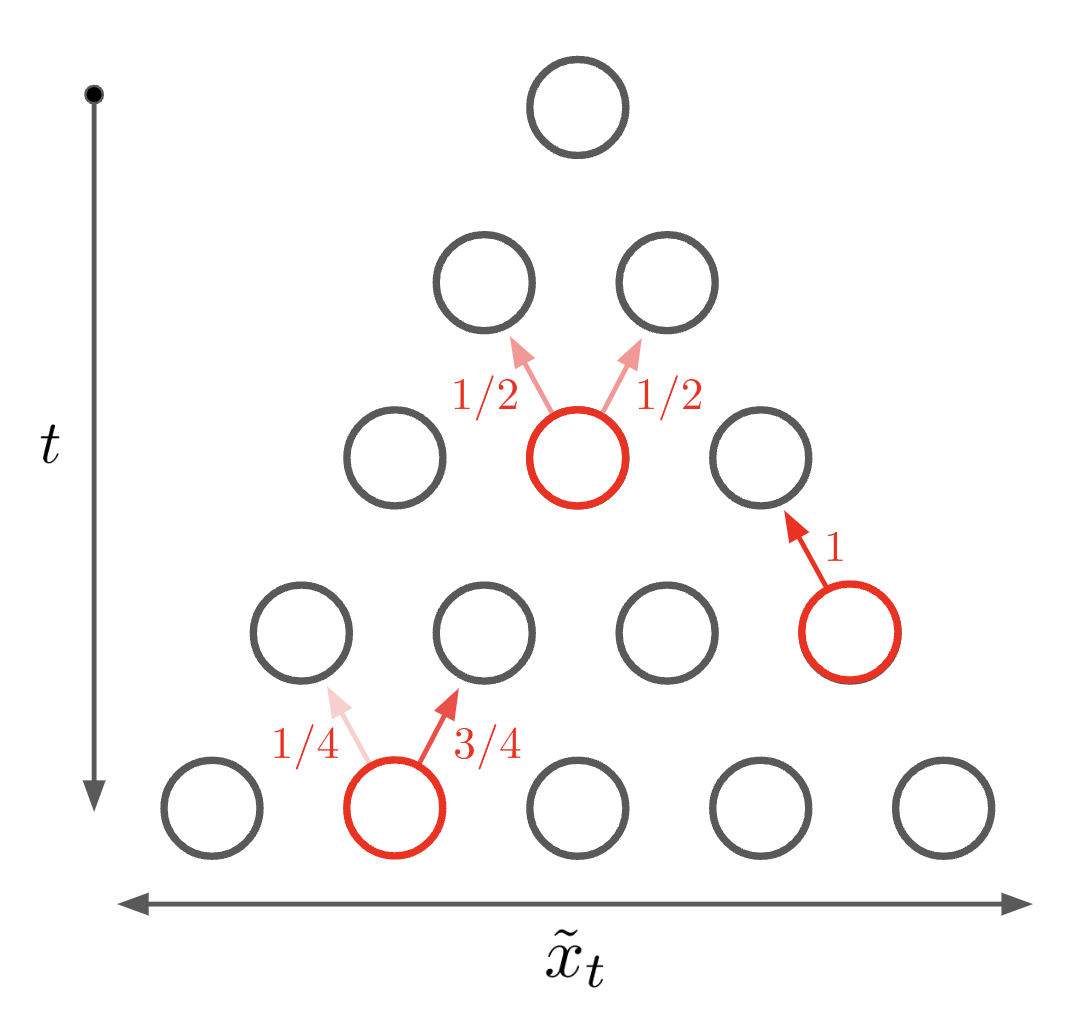 \[\begin{equation} \label{eqn:p_forwards_jump} p\left(x_{t'} | x_t\right) = 2^{-(t' - t)} \left( \begin{array}{c} t' - t \\ x_{t'} - x_t \end{array} \right). \end{equation}\]With the same Bayesian approach as before, we can derive transition probabilities for a backwards jump. This yields that