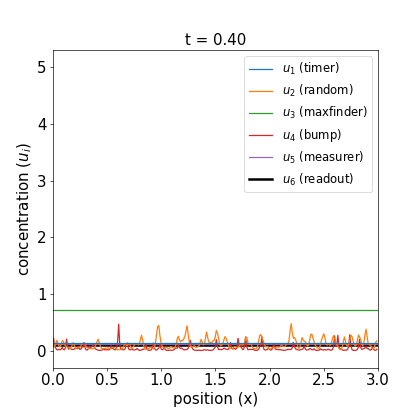 We’ve seen that it’s possible for a reaction-diffusion equation with random initial conditions to measure the global volume of its vessel despite its being a fundamentally local process. So, could there be real chemical species that’d make this work in reality? Perhaps the greatest stretch is the continuously-increasing timer ($u_1$) that regulates other reactions, but then we’ve already seen that clock reactions exist in practice, and in the worst case we could drop the timer and have the experimenter mix in new chemicals at specified times. The readout $u_6$ converging to $\propto 1 / u_5$ is a bit suspicious, too – it’s rare for a reaction to be sensitive to the inverse of a concentration – but I suspect one could design a process that approximates that sensitivity in some regime, and in the worst case again, the chemist could just measure $u_4$ and make that calculation manually. It’s worth noting that this process in reality would probably include additional species for support (just as a motor contains many more parts than those which are directly part of the core process). That said, I see nothing that suggests that something like it couldn’t work in the real world. If you know more chemistry than I and have thoughts, please reach out!