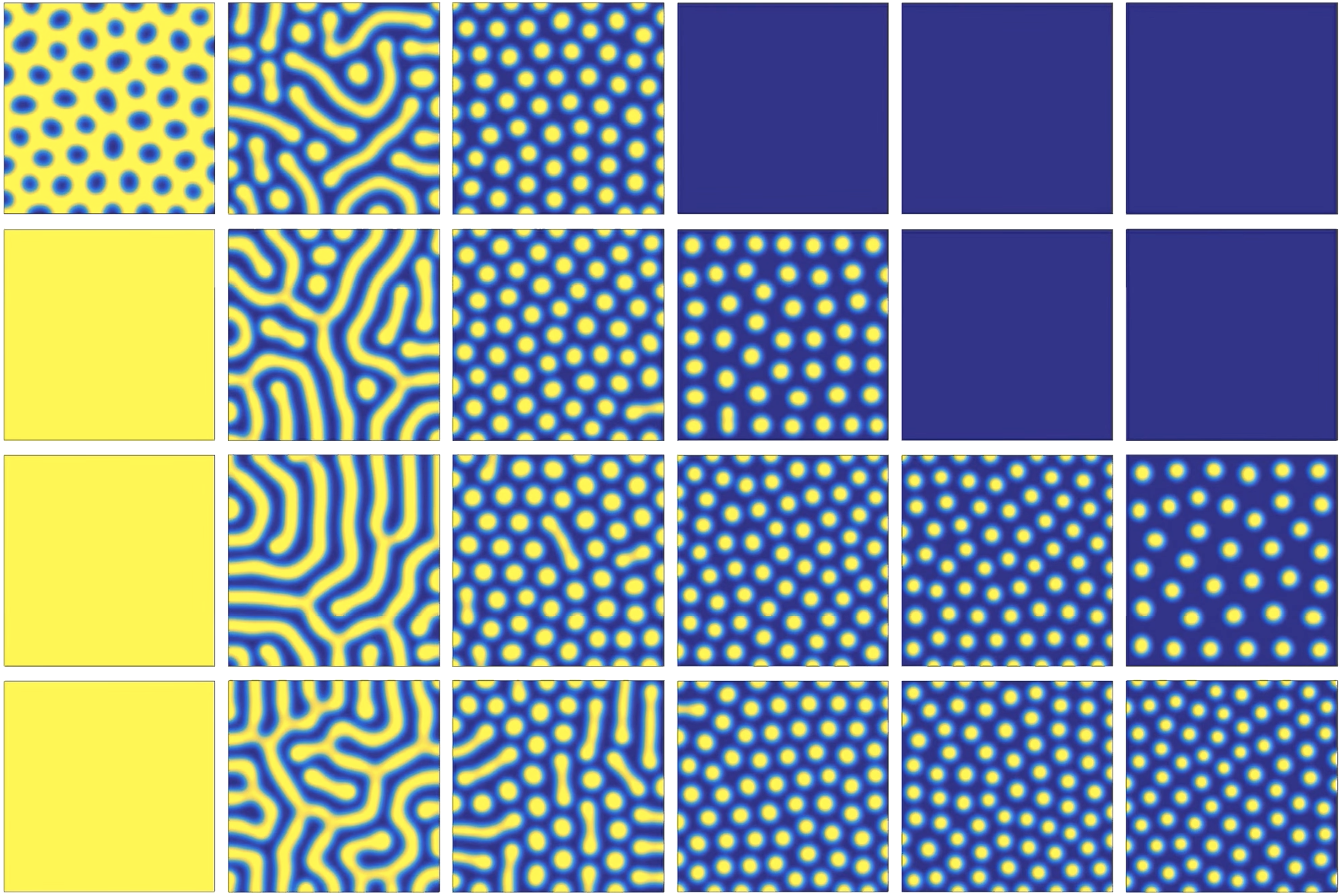 If you’ve heard of reaction-diffusion equations before, it’s probably in conjunction with Turing patterns. Turing patterns are beautiful, amorphous-looking spatial patterns in the concentration of chemical species that emerge spontaneously as a result of reaction diffusion evolution with certain kinds of reaction term. Here are some examples (source here):