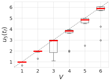 Fig 2. Final readout concentrations $u_5(t_f)$ with $t_f = 70$ over 10 trials with $V \in \{1,...,6\}$.