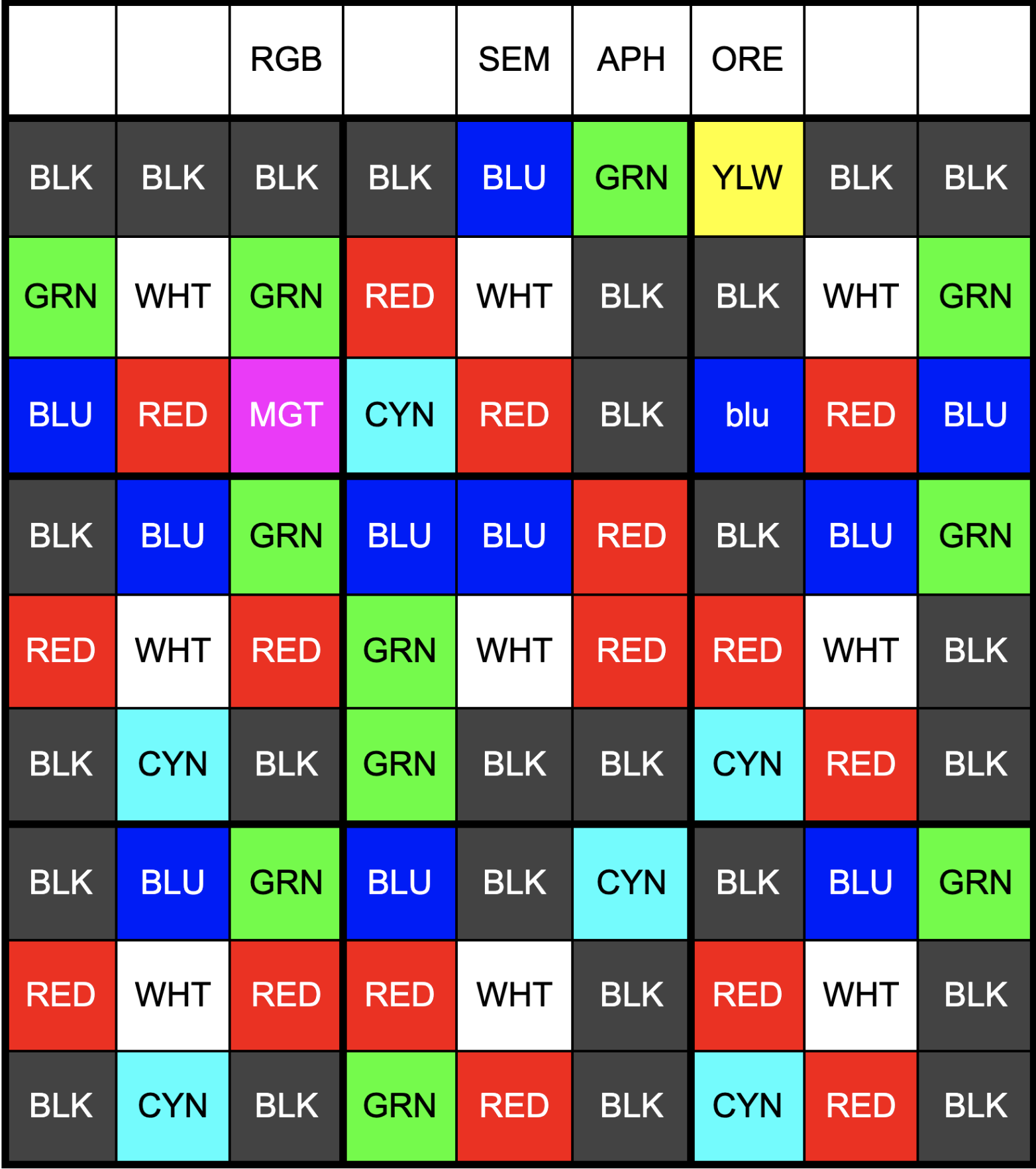 Though the grid looks pure white and black at first glance, the squares are actually a polychromatic collage of different dark shades, and some of the lines are grey. Except for a few true-black squares, each dark square had red, green, and blue values between 1 and 26, and their color could be read as a three-letter string. Most of these denoted colors, like BLK, WHT, RED, GRN, or BLU. Recoloring squares accordingly, we get the following grid: