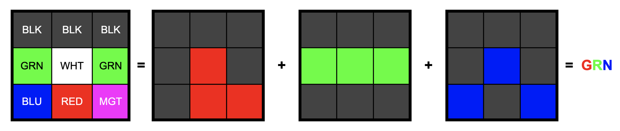 Each subgrid gave a color just like each square, suggesting we should view the subgrids as squares in a grand 3x3 metagrid. Translating every subgrid (and discarding the instruction row) gave this metagrid: