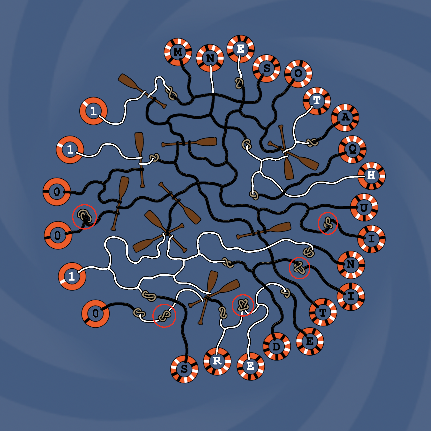 With this insight, you can work through the circuit, propagating bits gate by gate through the circuit until each lettered life ring is given either a zero or a one. Upon doing this and taking the letters corresponding to 1s, you get the phrase NOTQUITE, a sign they’re close but not quite right. This is shown below, with wires carrying 0s and 1s colored black and white respectively.