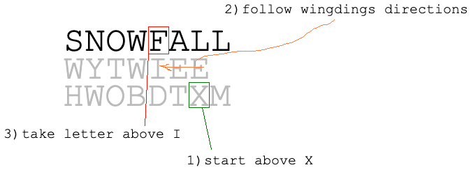 The flavor text hints at different font names, with the final instruction referencing wingdings. In the block below, the coherent writing matches wingdings text letter by letter. For example, “RAIN” corresponded to a raindrop, wingdings for S, and “LEFTIST APPROVINGS” translated to a finger pointing left and a thumbs up, wingdings for EC. Fully translated, the wingdings spell “START ABOVE XS FOLLOW DIRECTIONS & LOOK ABOVE ENDPO-INTS.”